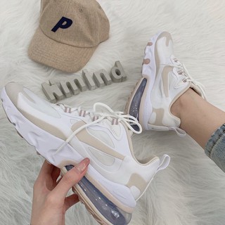 This nike air max 270 react features a white base with tan overlays.
